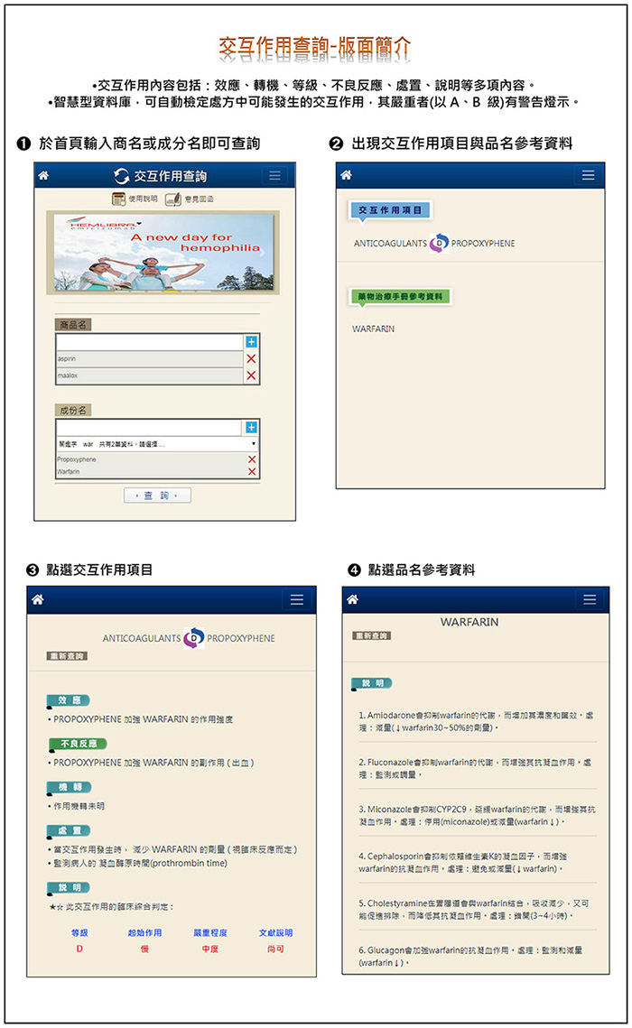 詳細的藥品查詢」單元、「交互作用查詢」單元、「辨識作用查詢」單元、「健檢診斷平台」單元(附疾病資料庫)。